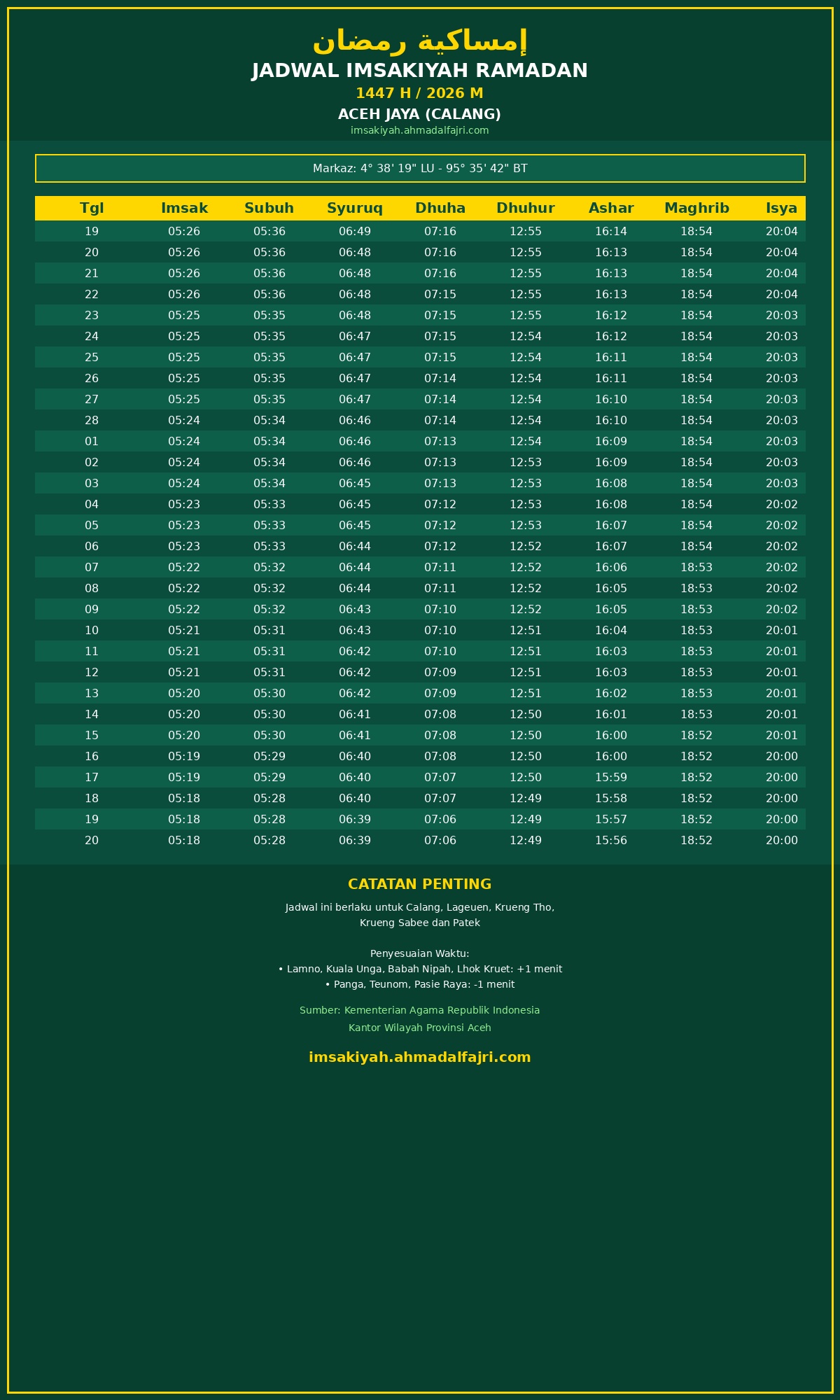 - Jadwal ini menggunakan metode hisab rukyat dengan referensi Markaz Masjid Agung Baitul Izzah Calang.