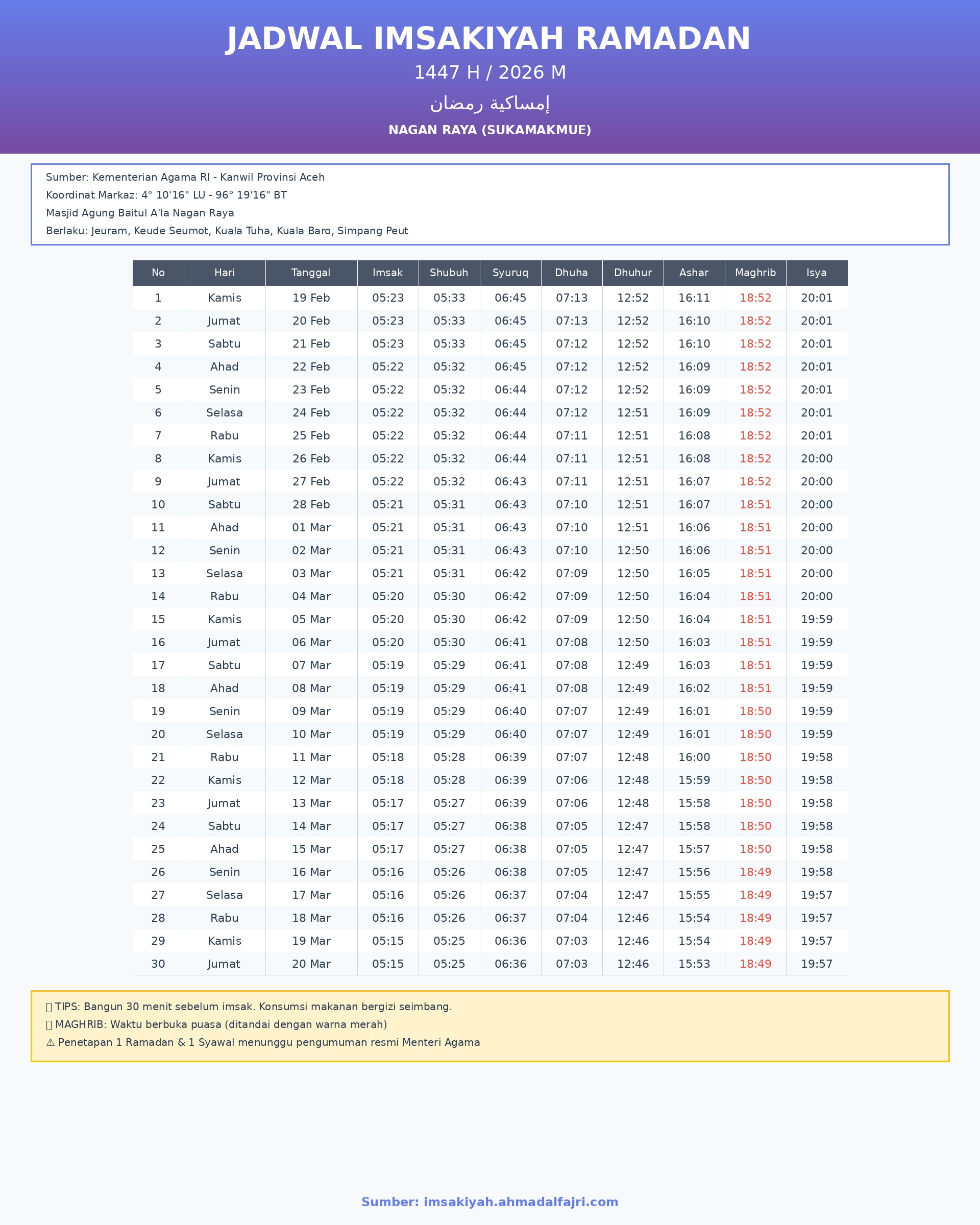 Jadwal ini mencakup waktu lengkap mulai dari 19 Februari 2026 hingga 20 Maret 2026 (30 hari bulan Ramadan). Jadwal sudah disesuaikan dengan perhitungan Kementerian Agama RI untuk wilayah Nagan Raya.